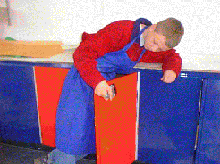 The Changing Rooms team have done the task well and succeeded in decorating the usually dull and boring D.T room. Bright colours have been used such as sunny yellow, rosy red and sky blue.