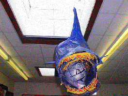 There is a fantastic model shark hanging up on the ceiling. It even has a man’s face inside its mouth!